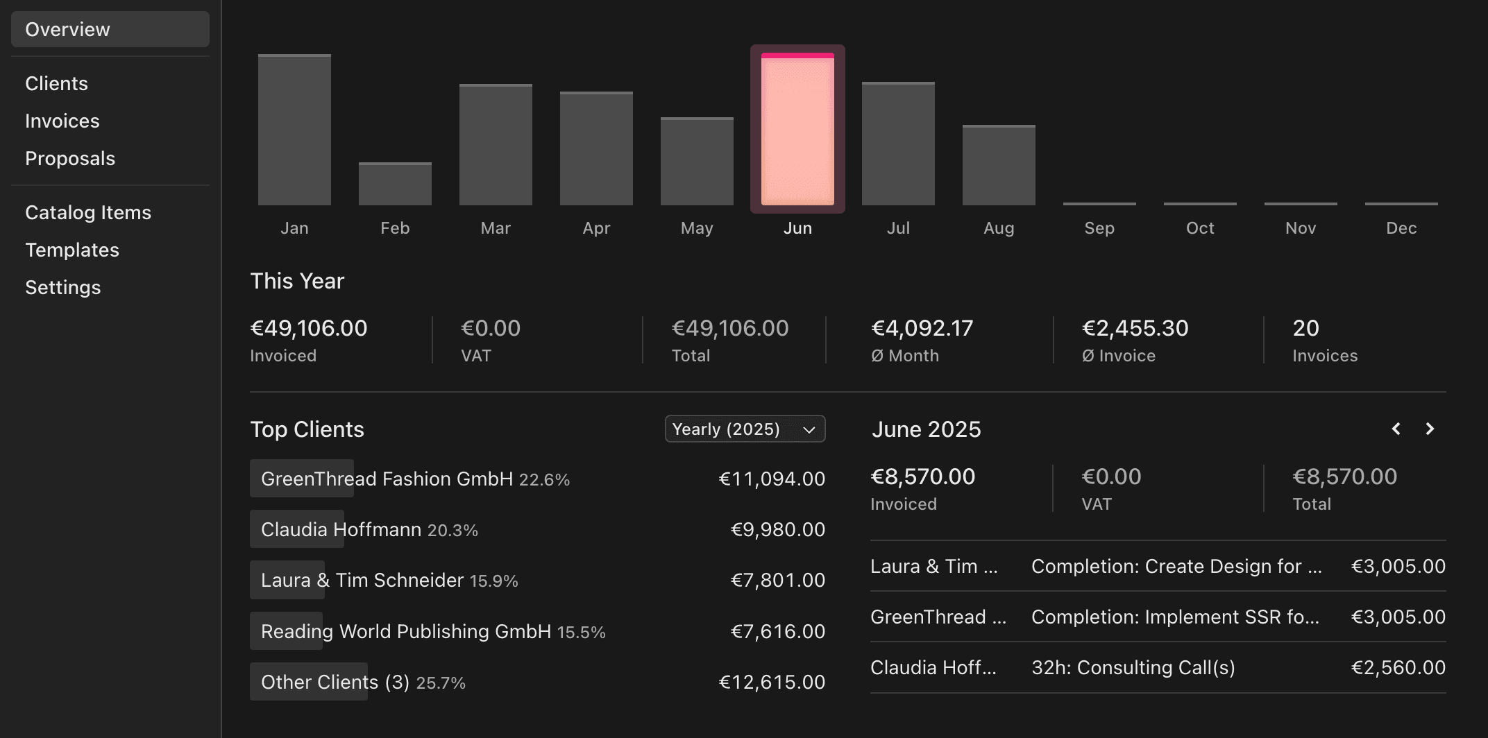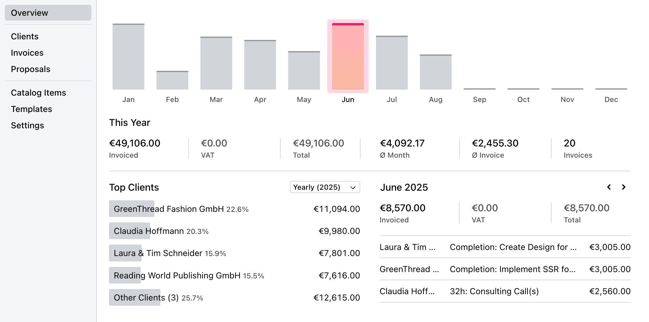 Cakedesk is an easy-to-use and useful invoicing software for freelancers and self-employed individuals. It helps me focus on my business. Thanks to active development, useful new features are constantly being added, making everyday work easier and more efficient.