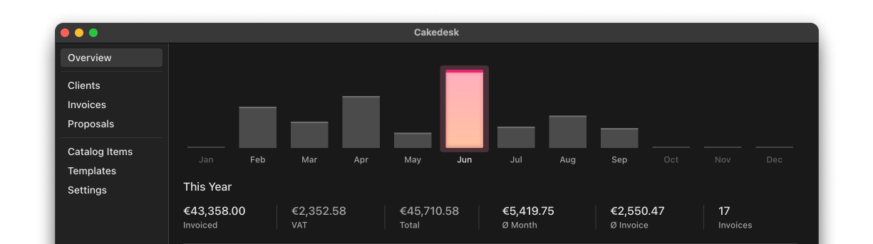 Cakedesk is exactly what I was looking for and have not found for so long. A simple, clean and yet very flexible software to create elegant invoices and quotes. It even lets you create your own templates, which I especially like. And the icing on the cake is the absolutely great support I received from Max. Thanks a lot!